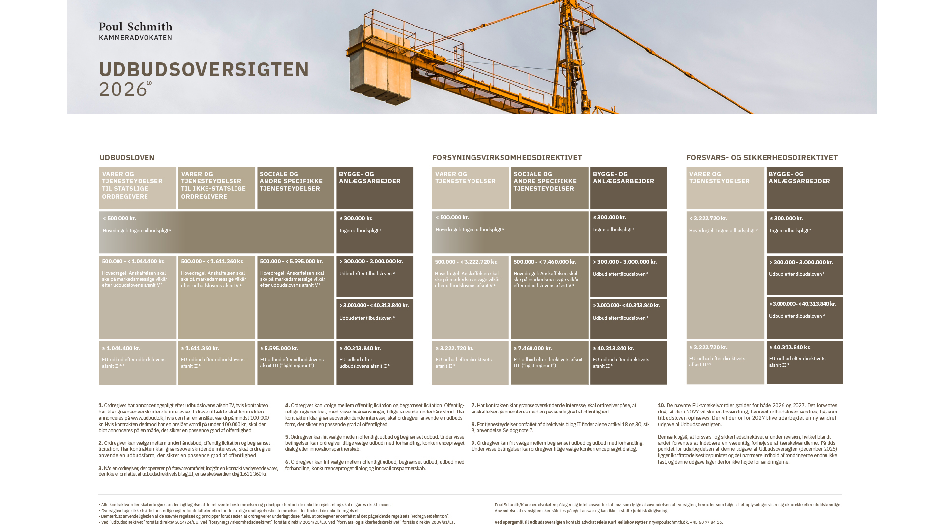 Udbudsoversigten giver et overblik over de centrale udbudsretlige regelsæt (udbudsloven, forsyningsvirksomhedsdirektivet og forsvars- og sikkerhedsdirektivet) og kan bruges som hjælpemiddel ved valg af udbudsprocedure. Oversigten er opdateret med de nye tærskelværdier for 2026.