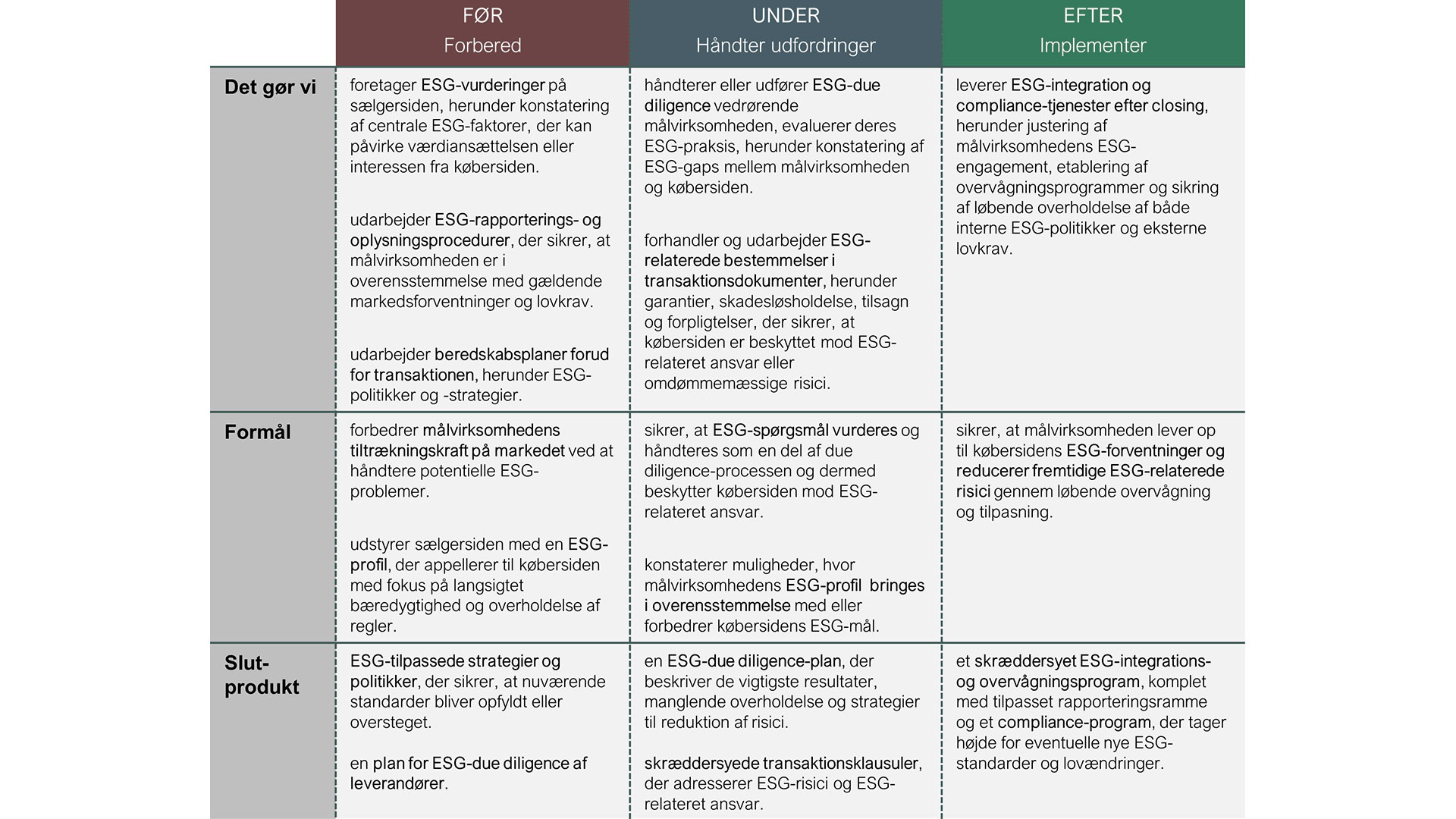 Integration af ESG-praksis efter transaktionen. Implementering af effektive ESG-regelsæt efter transaktionen er helt central for at sikre en problemfri integration i forhold til de involverede parters kulturer og praksis, herunder planlagt tilpasning af politikker, rapporteringsstandarder og medarbejderinddragelsesinitiativer, der kan fremme bæredygtig værdiskabelse og mindske risici forbundet med forskellige ESG-standarder.